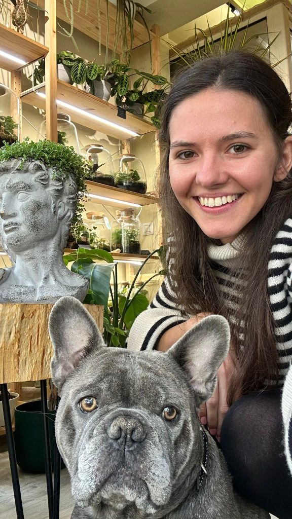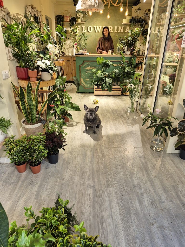 La intrare te întâmpină Rocky, un buldog francez, bine cunoscut comunității florăriei, dornic de joacă și mângâiere, aducând la înaintare tot arsenalul menit să îți capteze atenția: minge pentru joacă, lăsat pe spate pentru mângâiat, alergat printre flori, veselie. Primul contact cu atmosfera se face la nivel olfactiv, mirosul vieții înseși te izbește, florile transmit prospețime și vitalitate, completată imediat de o explozie vizuală care nu obosește, un pastel aranjat cu gust și unicitate. Totul are un loc fix, bine stabilit, care creează un echilibru al locului ce așterne liniștea și calmul în interiorul ființei. Aici este locul de unde nu cumperi flori, ci emoții, fiecare buchet fiind un autoportret al autoarei.