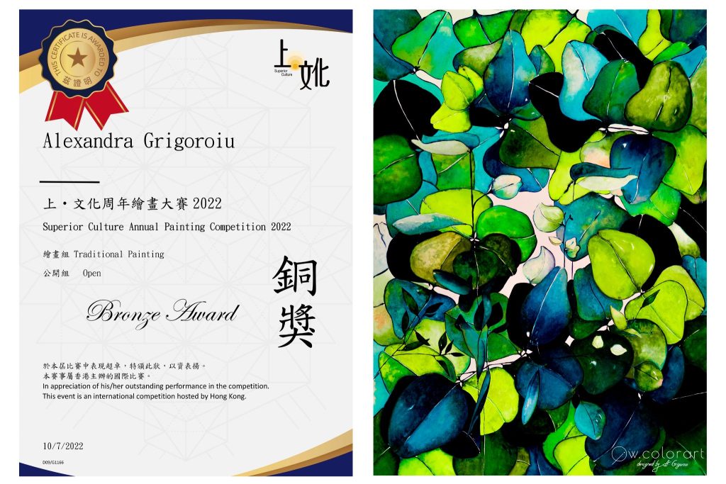 Picturile ei sunt premiate în galerii de artă internaționale: Premiul III la J. Mane Gallery din Chicago, SUA; Premiul I la concursul Dali’s Mustache în Spania; medalia de bronz în Hong Kong pentru lucrarea „Patru anotimpuri”; Certificat pentru recunoaștere artistică La Pinacothèque, Luxemburg; premiată de Institutul Național al Acuarelei în Niigata, Japonia. Premiile validează munca și talentul, aducând cu ele avântul de a merge mai departe și convingerea că această bucată din viața unui om spune totul despre cine este cu adevărat. Eu cred că arta spune foarte multe despre cel care o practică, despre modul în care percepe viața și felul în care alege să o transpună trecând-o prin filtrul celor mai adânci emoții și sentimente.